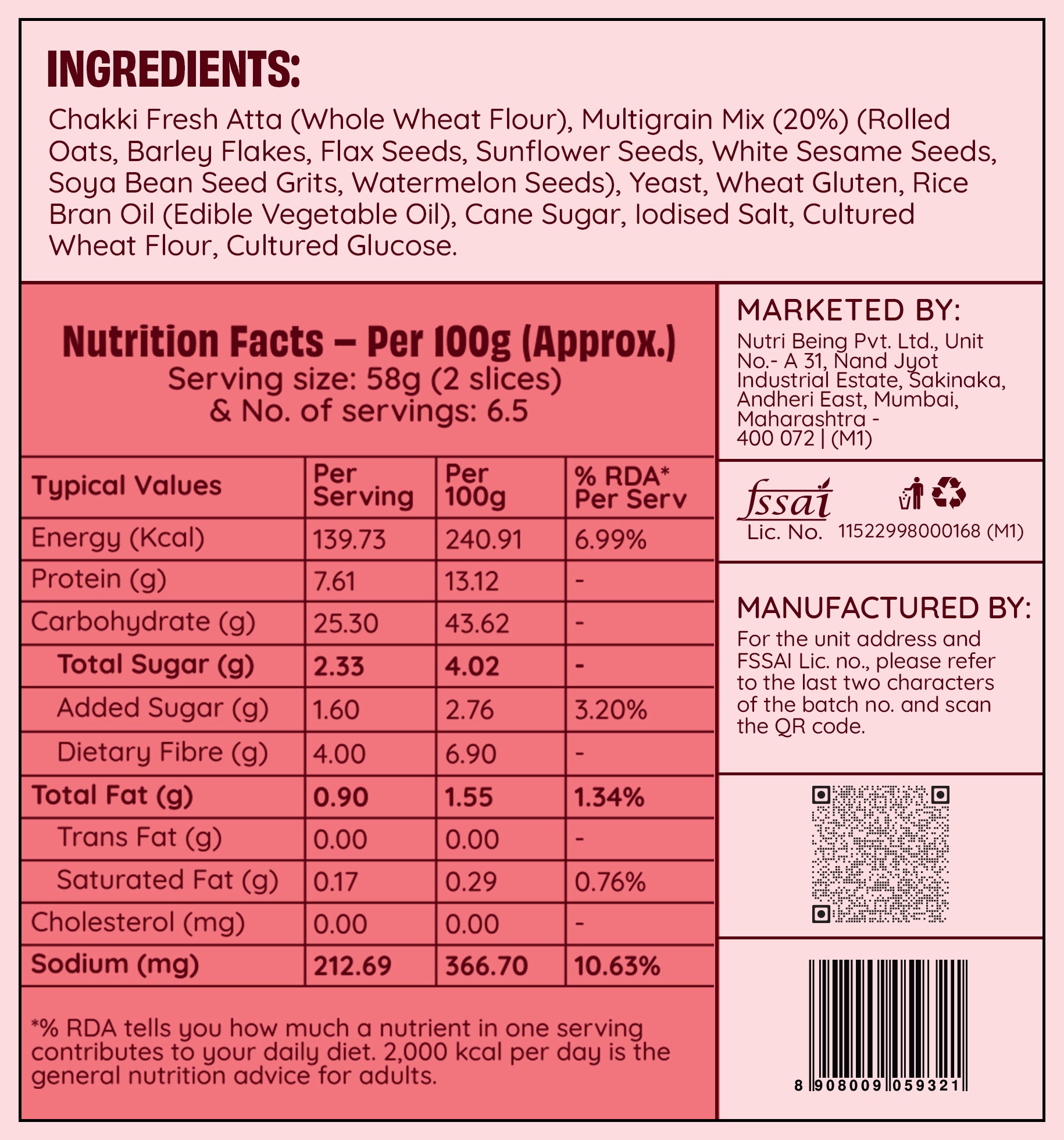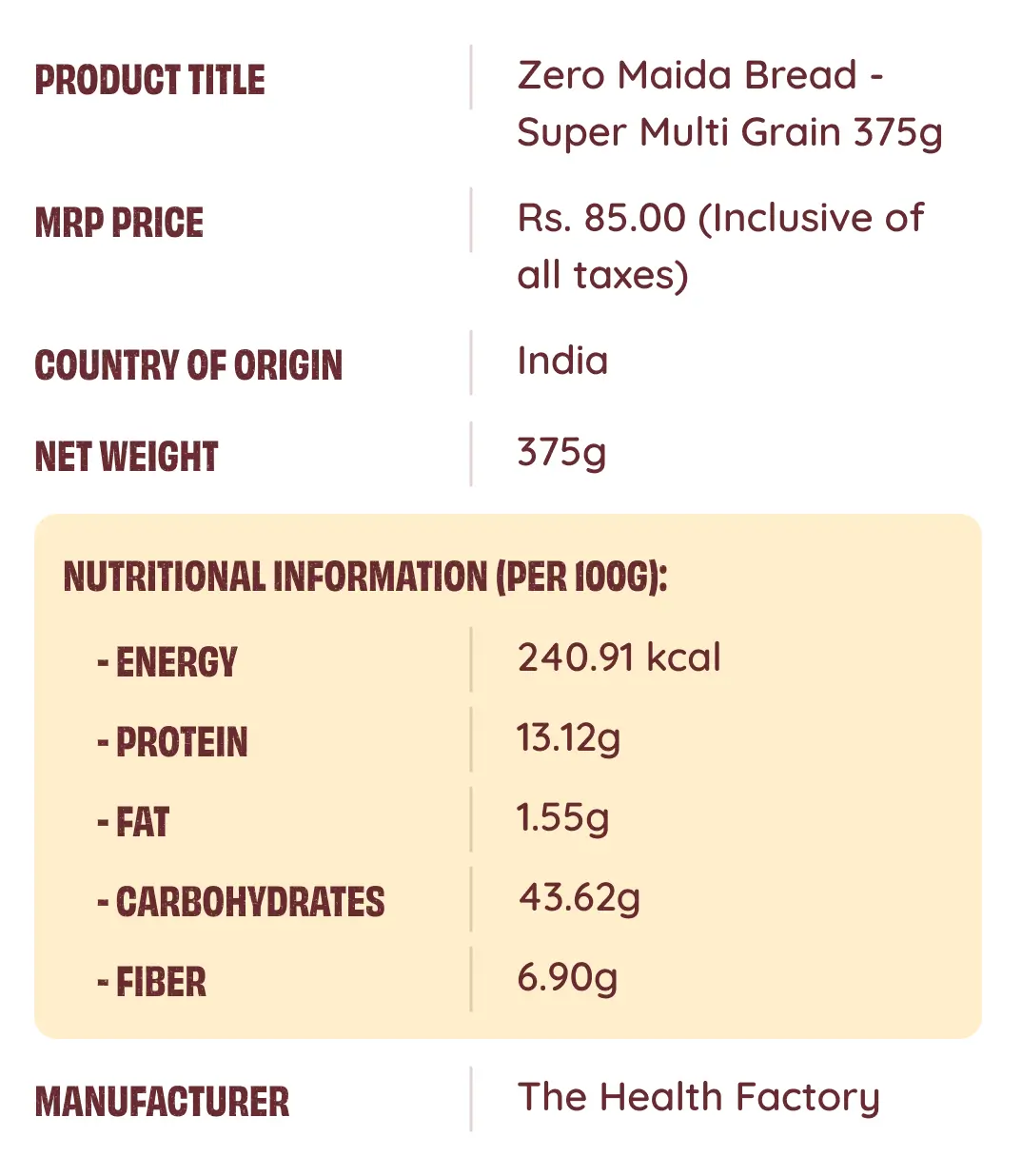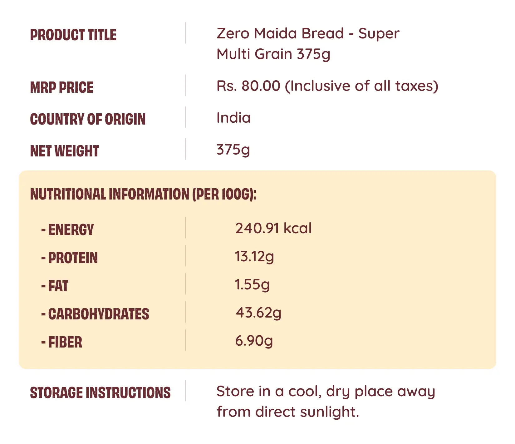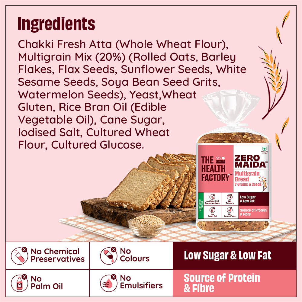 Unleash the power of our Zero Maida Super Multigrain Bread – a nutritional juggernaut made with 100% Whole Wheat and a wholesome blend of 7 grains and seeds. Crafted without any preservatives, colors, and maida, it features a robust mix of Oats, Soy Flakes, Ragi, Jowar (Sorghum), Bajra (Pearl Millet), Flax Seeds, and Sunflower Seeds for a truly nourishing bite.