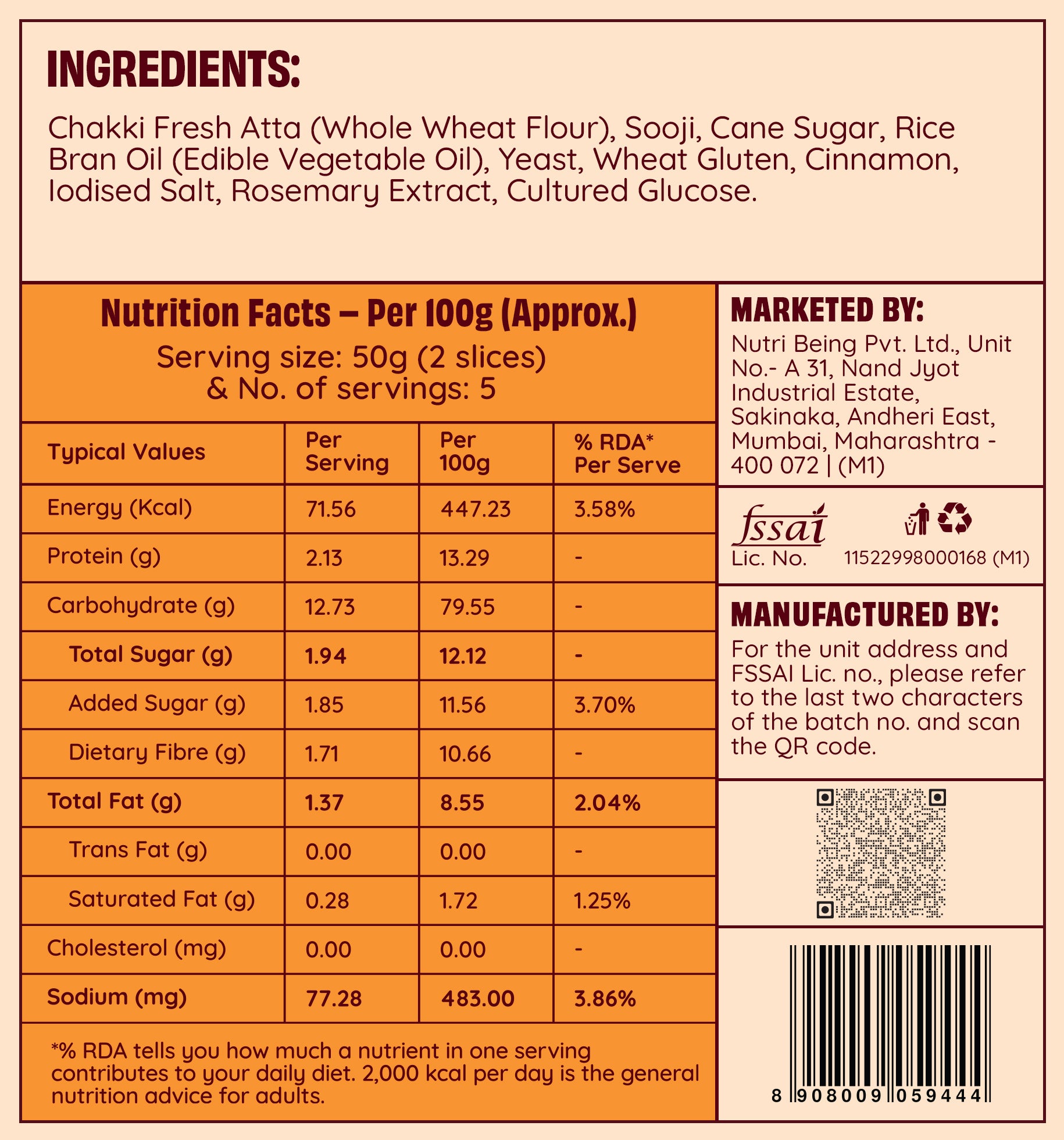 Chakki Fresh Atta (Whole Wheat Flour), Sooji, Cane Sugar, Rice Bran Oil (Edible Vegetable Oil), Yeast, Wheat Gluten, Cinnamon, Iodised Salt, Rosemary Extract, Cultured Glucose.