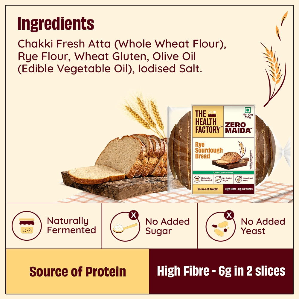 Zero Maida Rye Sourdough is baked with the goodness of Whole Wheat and Rye. It has no added sugar or yeast and is naturally fermented to attain a perfect texture. Transform your simple sandwiches to delicious meals.
