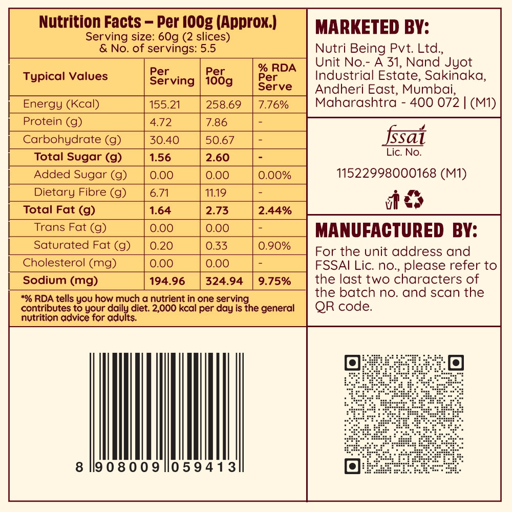 Made with whole wheat flour, rye flour, and olive oil, this sourdough is packed with fibre (6.71g per serving) and a good source of plant-based protein. It contains Zero added sugar, Zero cholesterol, and Zero trans fat. As a naturally fermented sourdough, it's easier to digest, gentler on the gut, and may help improve nutrient absorption.