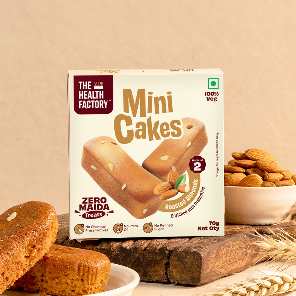 The Health Factory MINI CAKES are bite-sized cakes available in three flavours—Rich Vanilla, Roasted Almond, and Berry Blast, crafted with a focus on cleaner, healthier snacking. They are made with zero maida (no refined wheat flour) and use whole-food ingredients like chakki fresh atta (whole wheat flour), jaggery, and fruit or nut inclusions, making them a guilt-friendly alternative to traditional mini cakes.