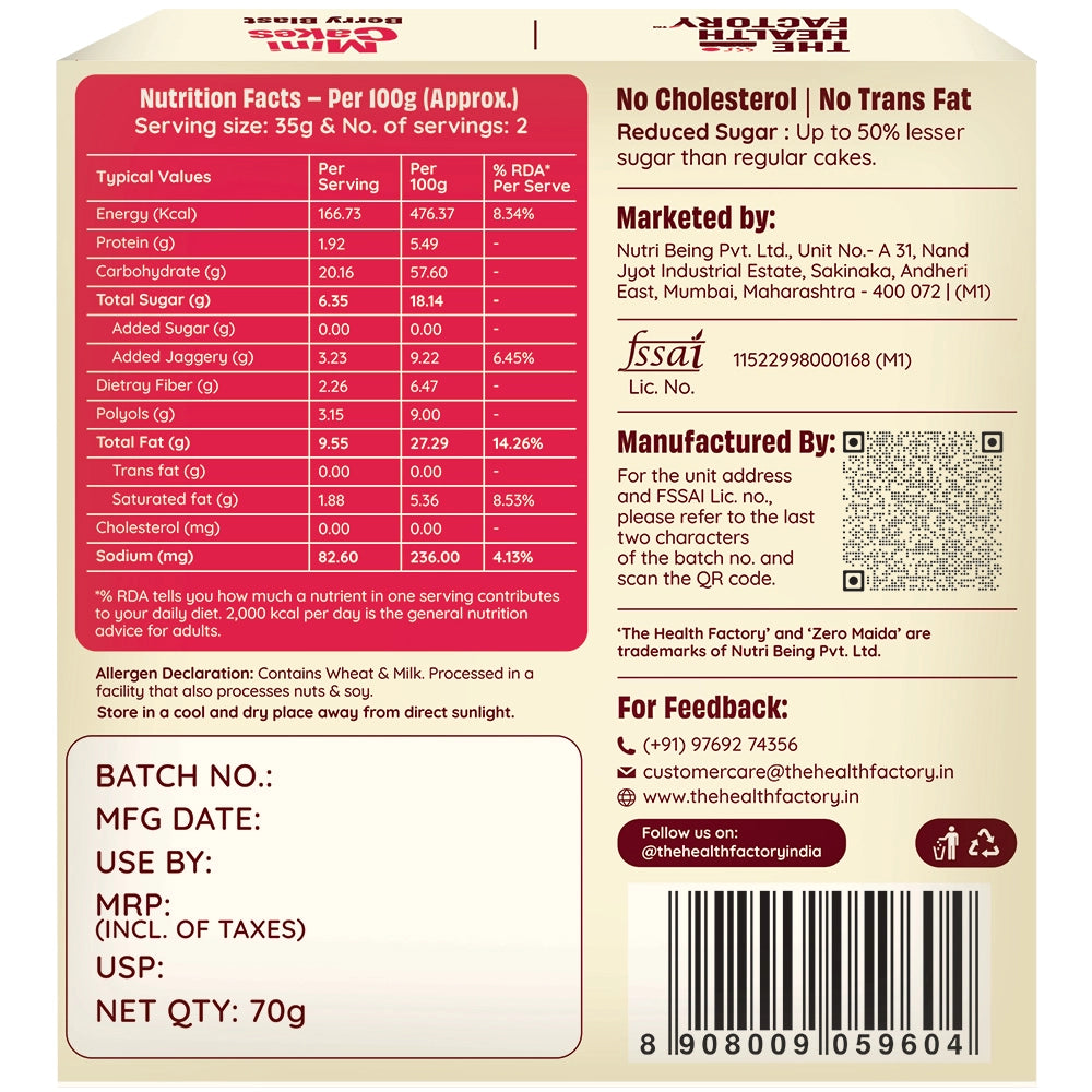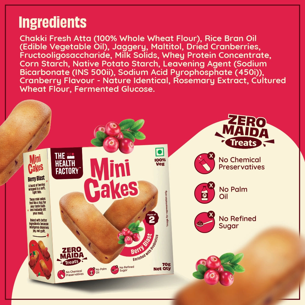 The Health Factory MINI CAKES are bite-sized cakes available in three flavours—Rich Vanilla, Roasted Almond, and Berry Blast, crafted with a focus on cleaner, healthier snacking. They are made with zero maida (no refined wheat flour) and use whole-food ingredients like chakki fresh atta (whole wheat flour), jaggery, and fruit or nut inclusions, making them a guilt-friendly alternative to traditional mini cakes.