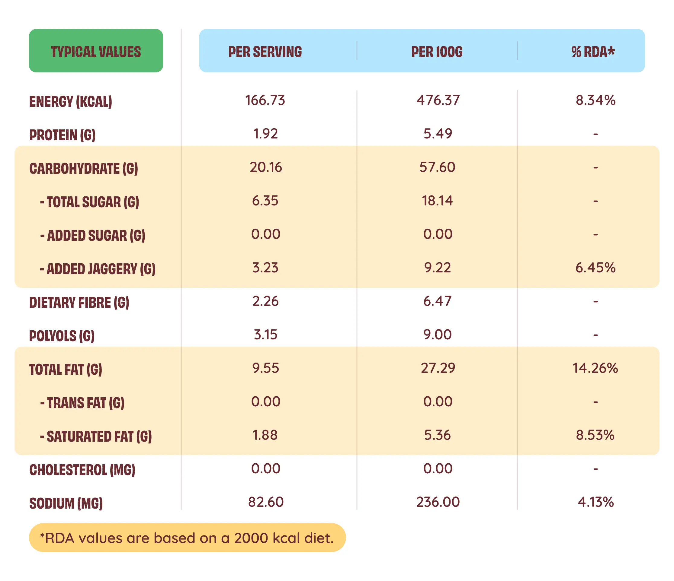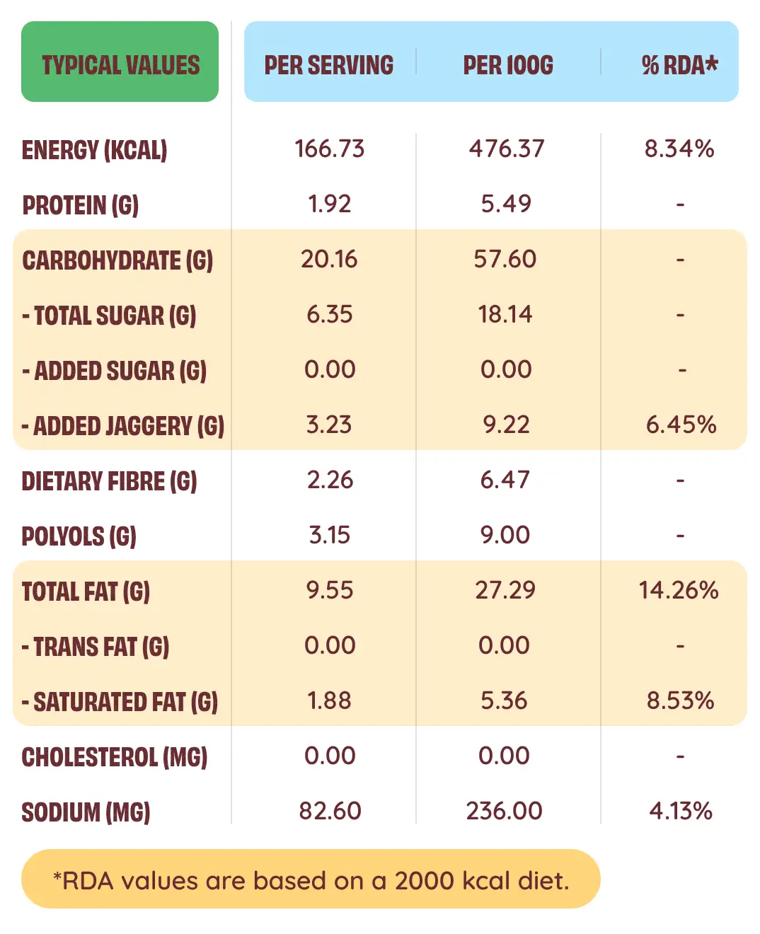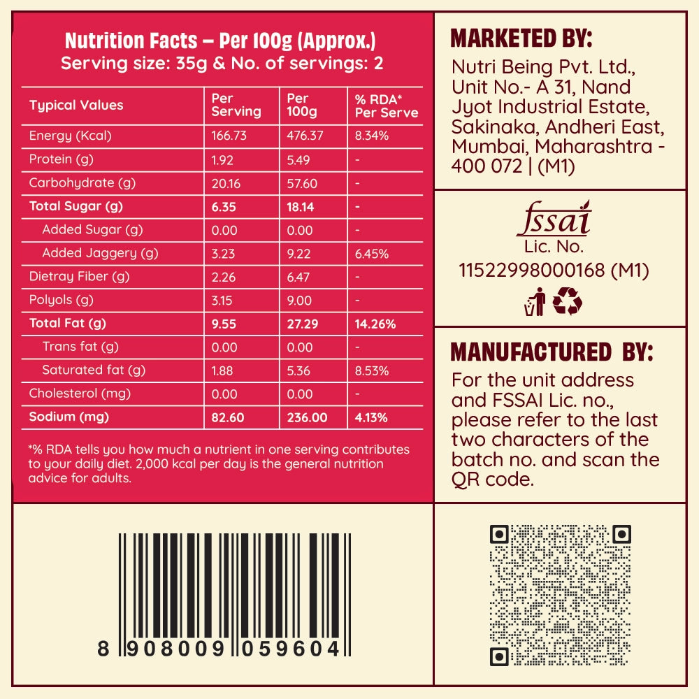 All three flavours are formulated with a clean label philosophy. Key ingredients include whole wheat flour (chakki fresh atta), rice bran oil, jaggery, maltitol, fructooligosaccharide, whey protein concentrate, and natural flavourings. They are free from chemical preservatives, refined sugar, and palm oil, aligning with The Health Factory’s clean-label commitment.