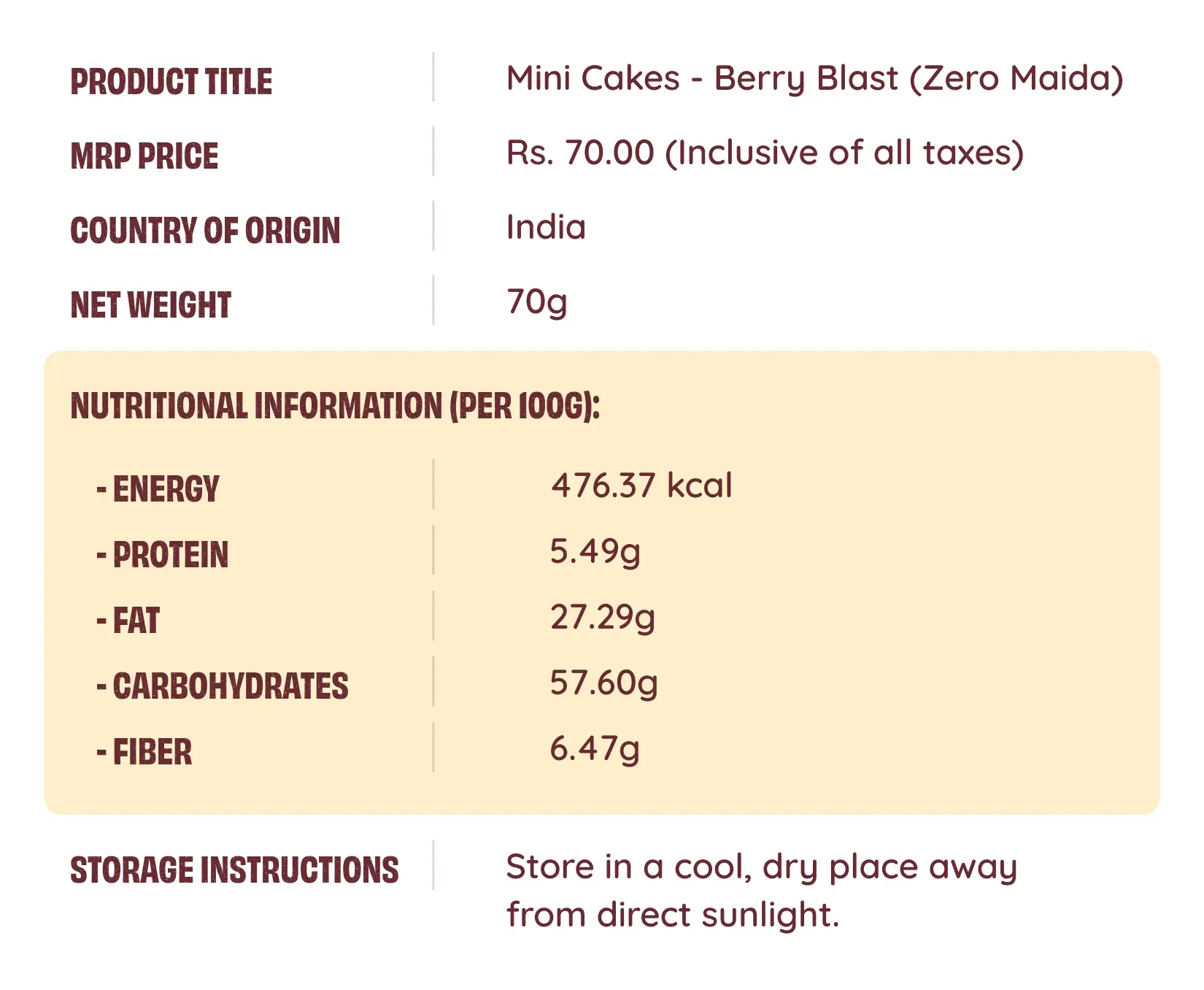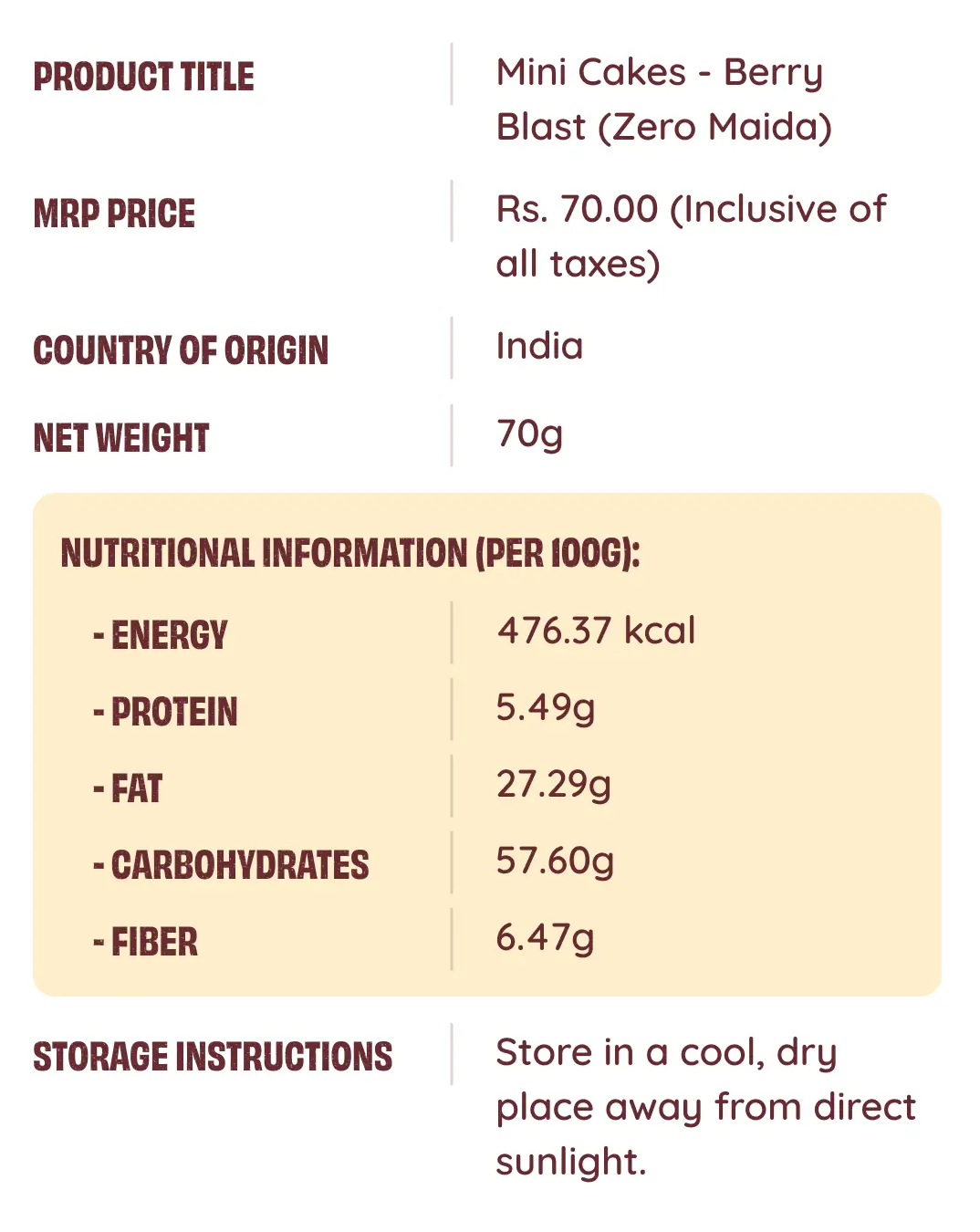 Each pack contains 2 mini cakes (approximately 70 g total), suitable for on-the-go snacking. All MINI CAKES have a shelf life of up to 20 days when stored in a cool, dry place, ensuring freshness and convenience.