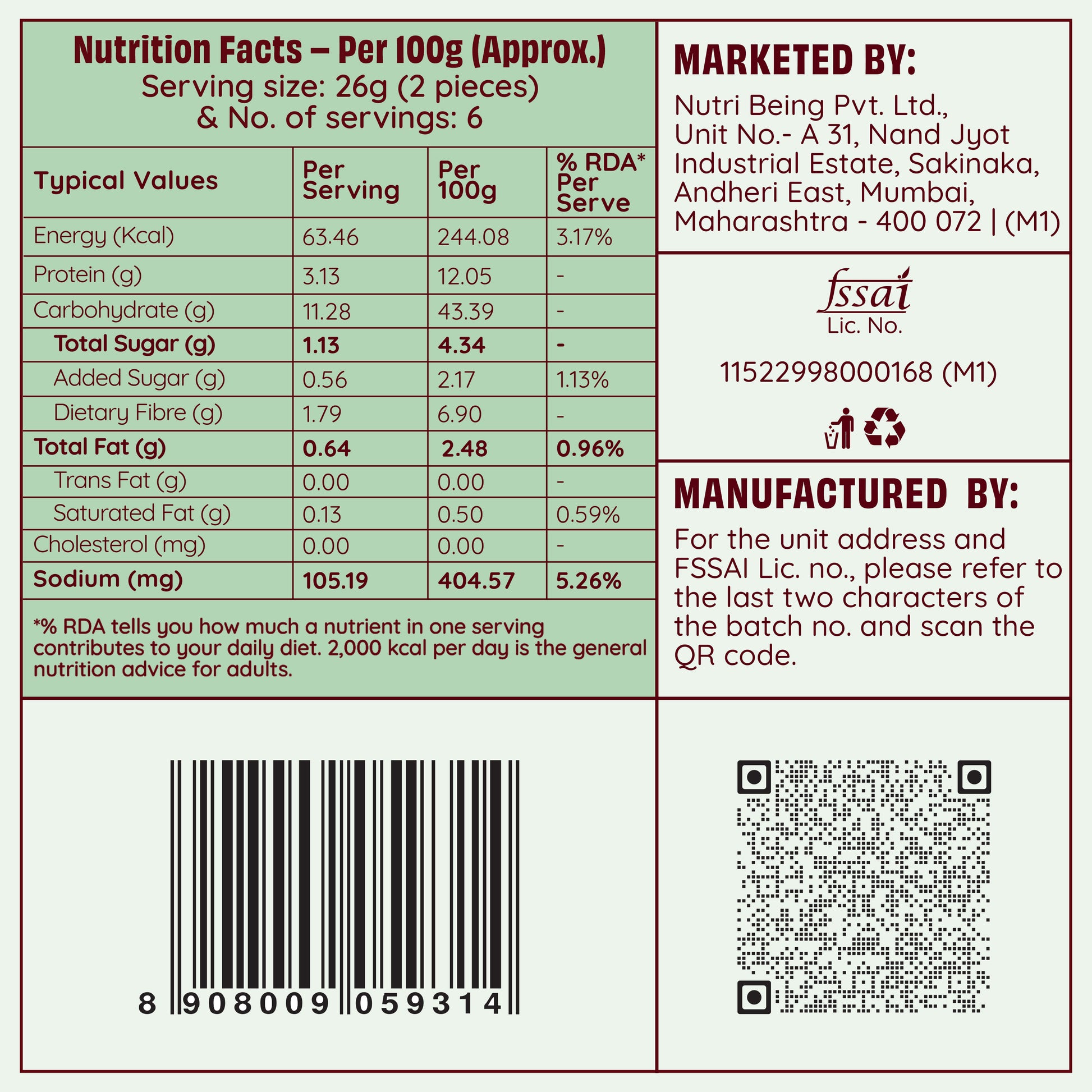 Dietary Fibre (g) | 1.79 | 6.90 | - |