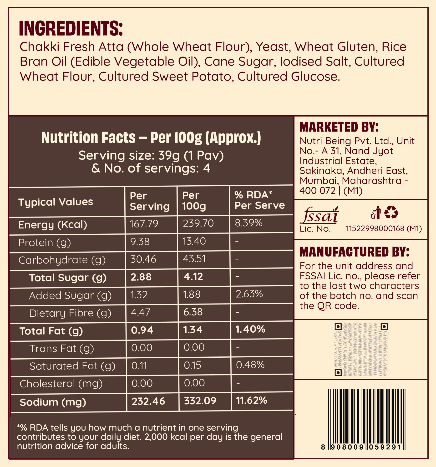 Chakki Fresh Atta (Whole Wheat Flour), Yeast, Wheat Gluten, Rice Bran Oil (Edible Vegetable Oil), Cane Sugar, Iodised Salt, Cultured Wheat Flour, Cultured Sweet Potato, Cultured Glucose.