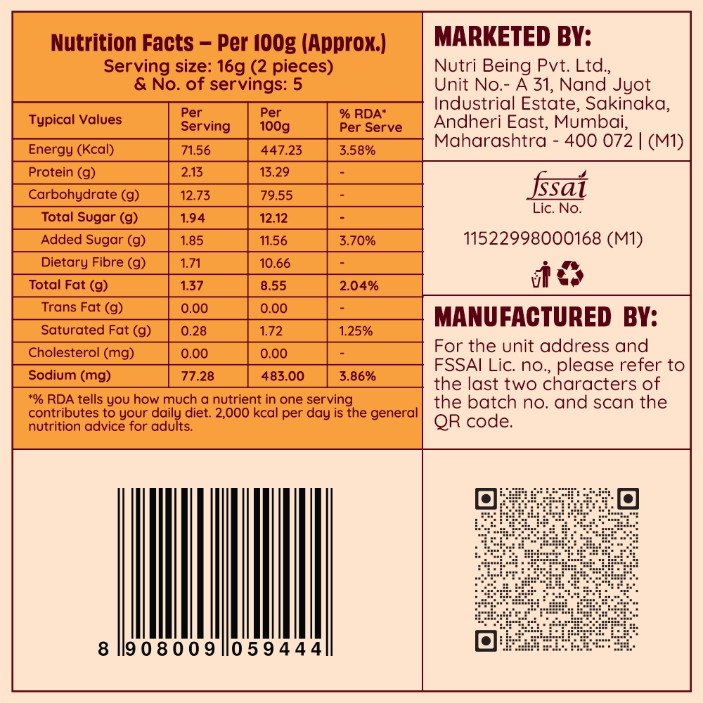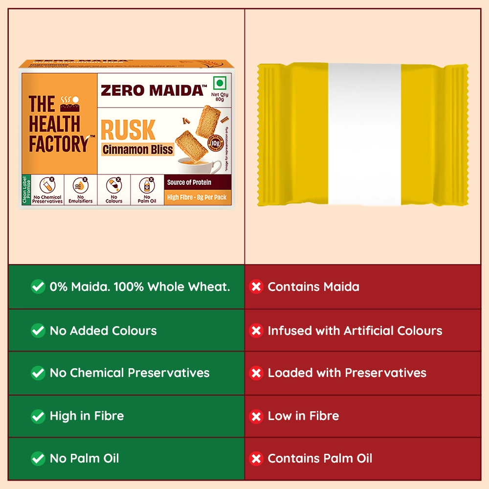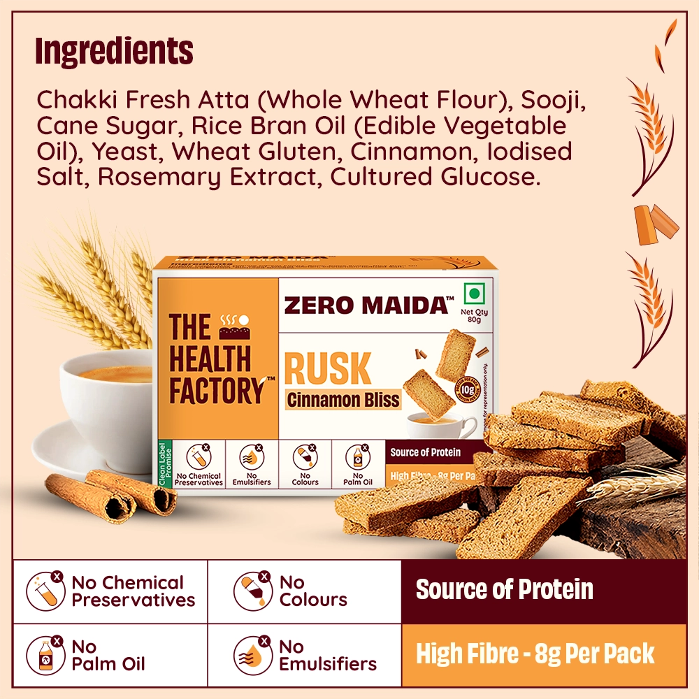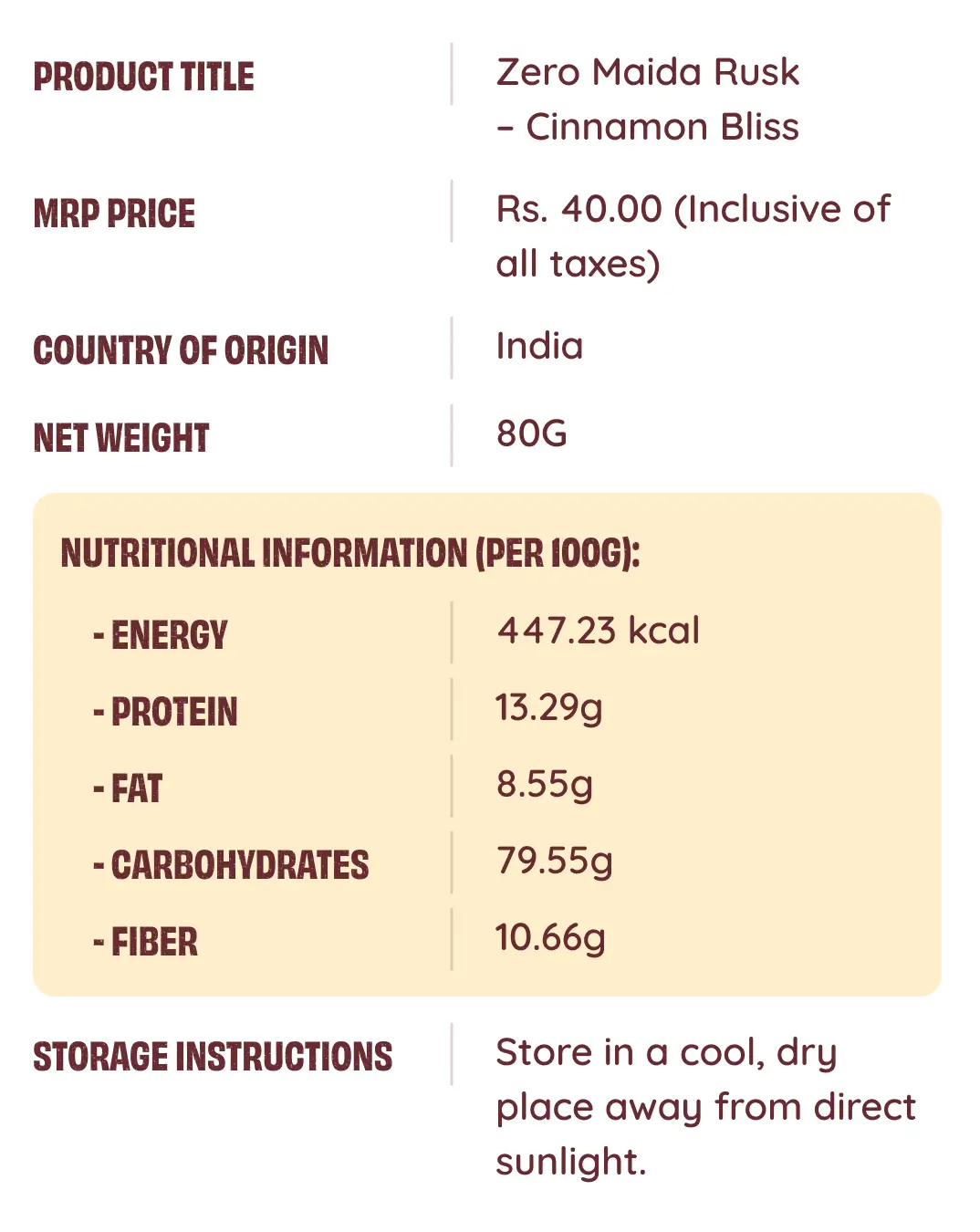 A punch of cinnamon in every crunchy bite! Zero Maida Rusk – Cinnamon Bliss is the perfect tea-time snack with the natural aroma of real cinnamon. Whole wheat goodness, full of fibre and protein, and absolutely zero maida, it delivers a wholesome crunch with no added colors or flavors. Elevate your chai moments with a rusk that’s warm, cozy, and full of flavor