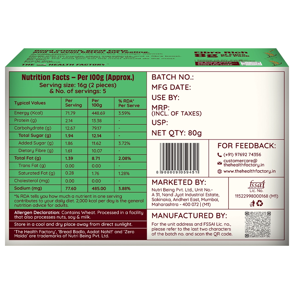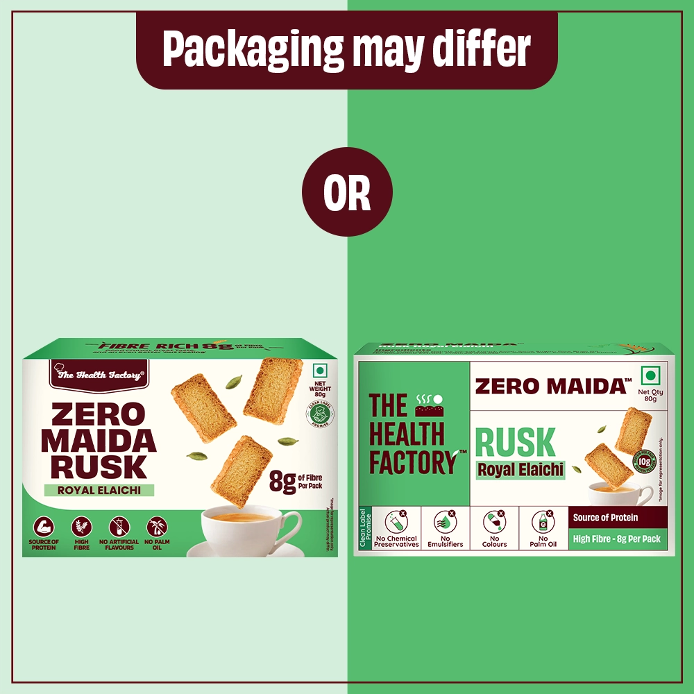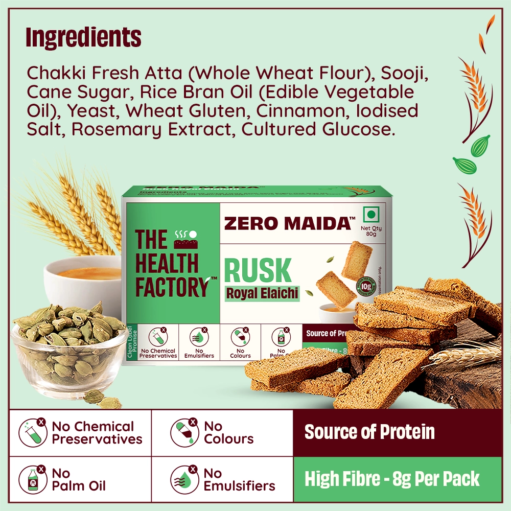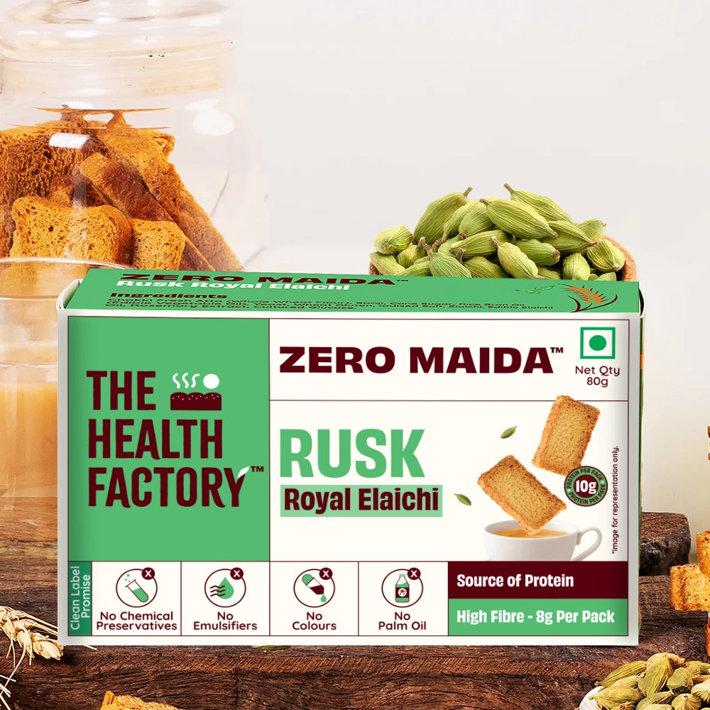 Crisp, aromatic, and perfect for your chai break! Our Zero Maida Rusk – Royal Elaichi is made with 100% whole wheat and absolutely no maida, delivering a wholesome crunch packed with protein and fibre. With no added colors or flavors, enjoy the pure aroma of natural elaichi, making your tea-time even more delightful—because great evenings deserve great chai and the perfect rusk