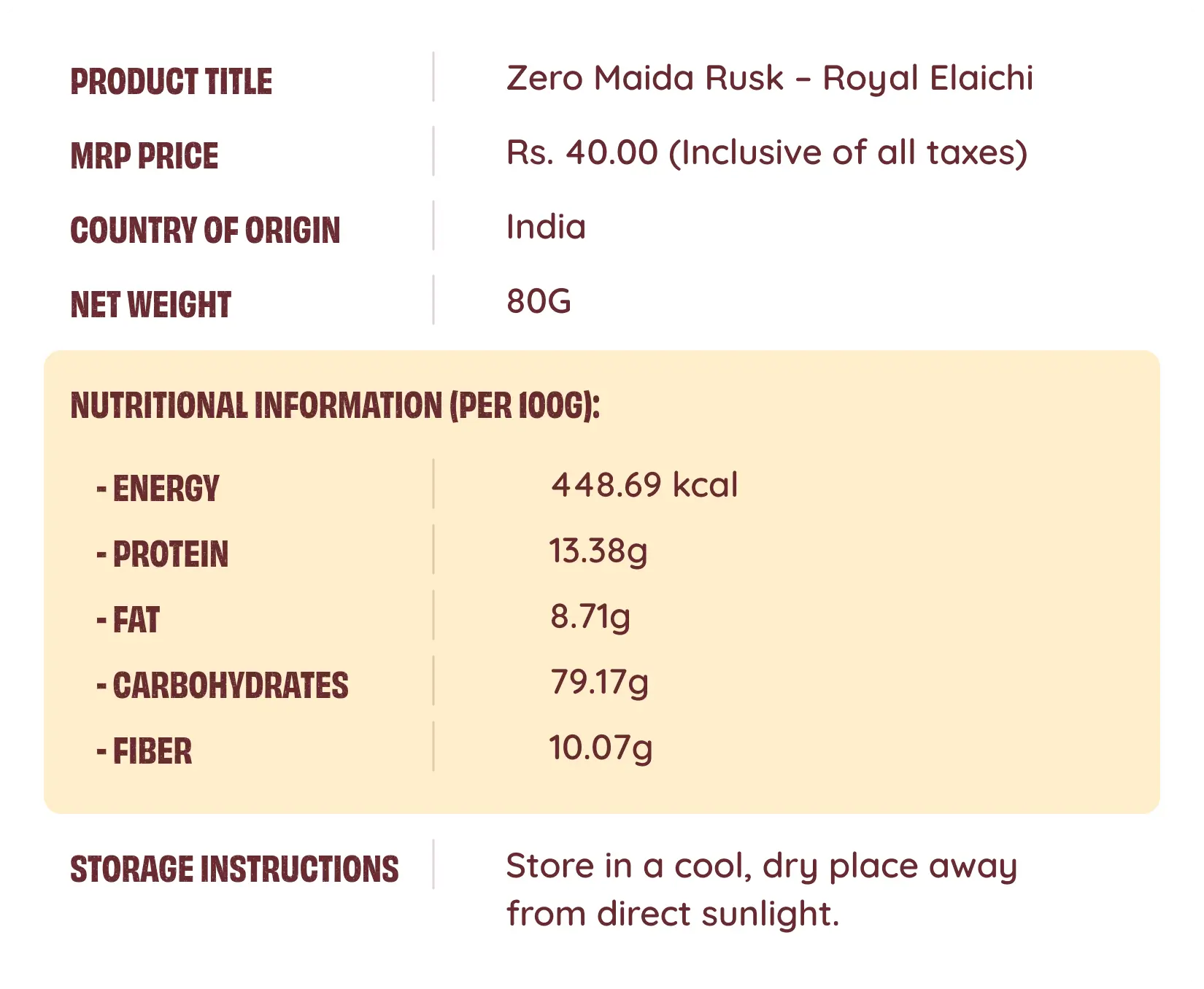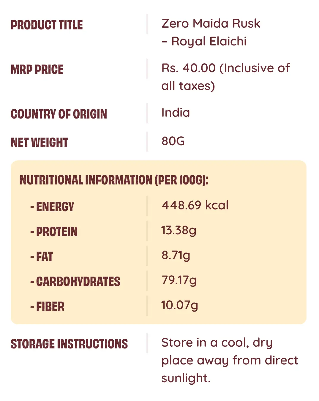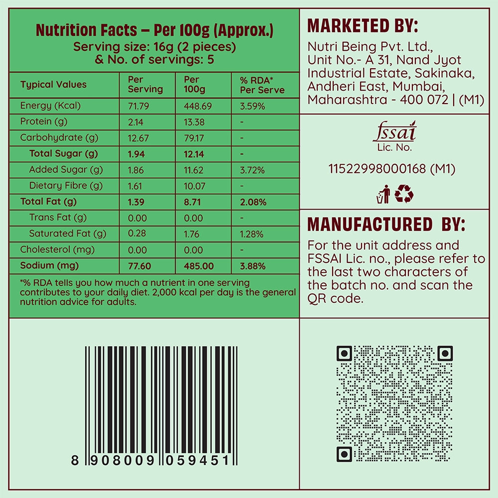 Crisp, aromatic, and perfect for your chai break! Our Zero Maida Rusk – Royal Elaichi is made with 100% whole wheat and absolutely no maida, delivering a wholesome crunch packed with protein and fibre. With no added colors or flavors, enjoy the pure aroma of natural elaichi, making your tea-time even more delightful—because great evenings deserve great chai and the perfect rusk
