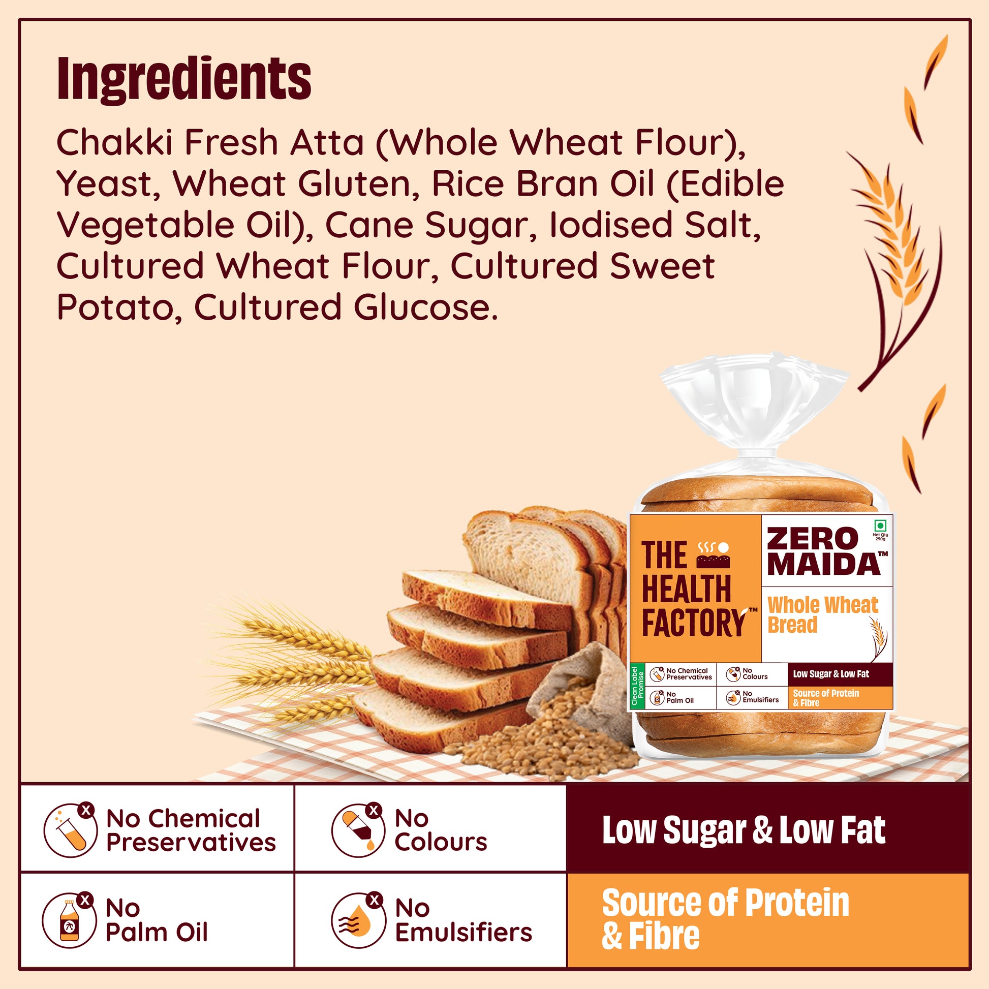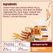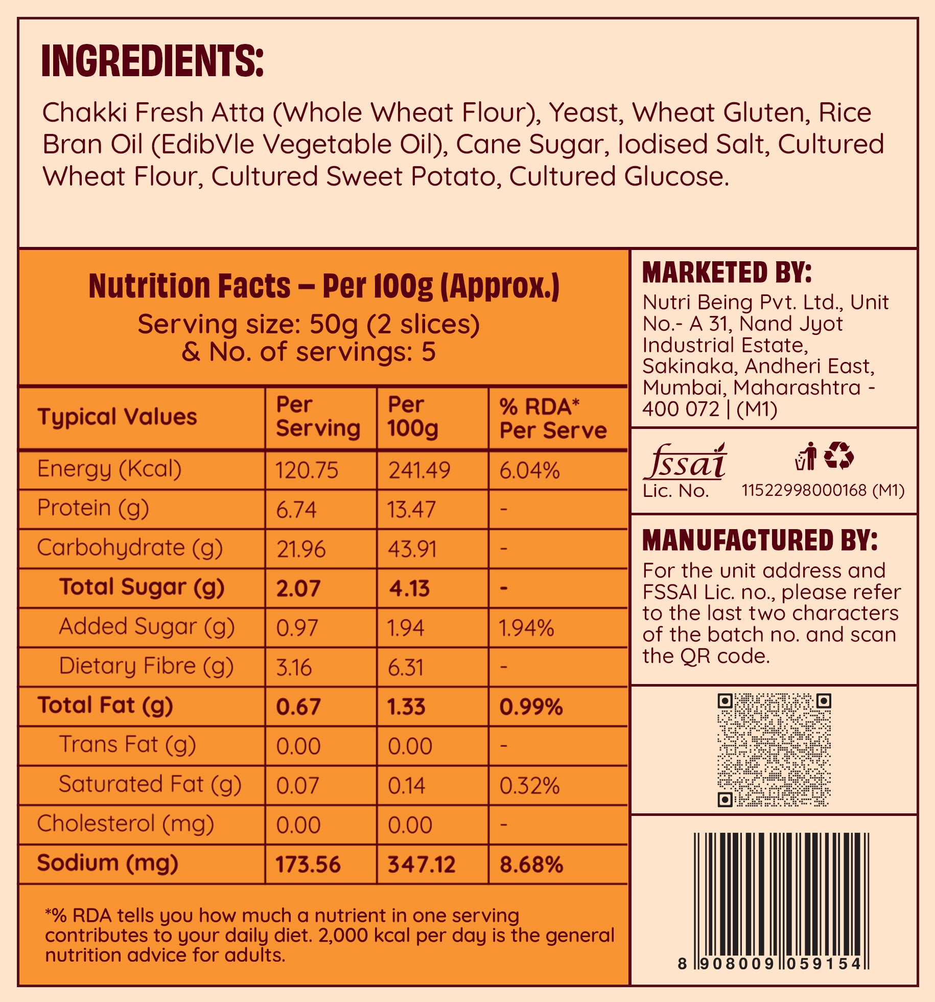 Chakki Fresh Atta (Whole Wheat Flour), Yeast, Wheat Gluten, Rice Bran Oil (Edible Vegetable Oil), Cane Sugar, Iodised Salt, Cultured Wheat Flour, Cultured Sweet Potato, Cultured Glucose.