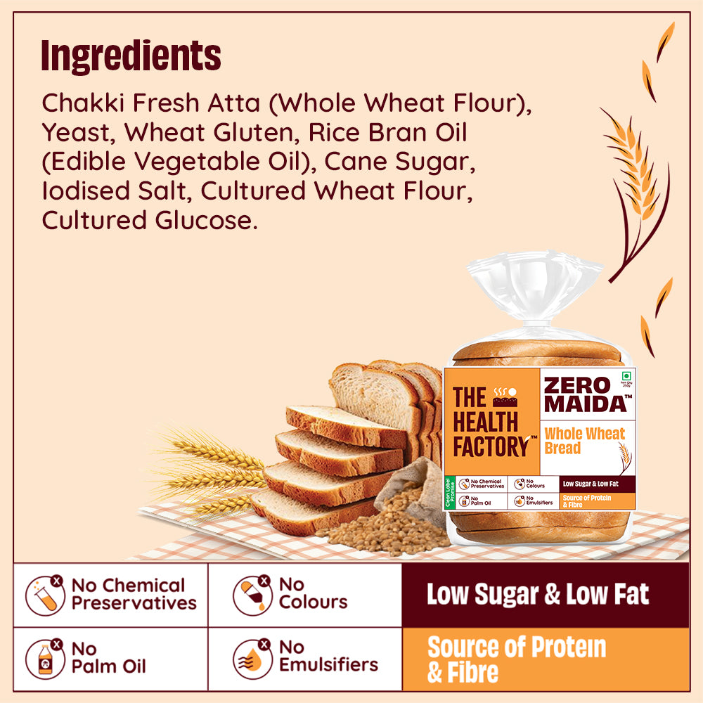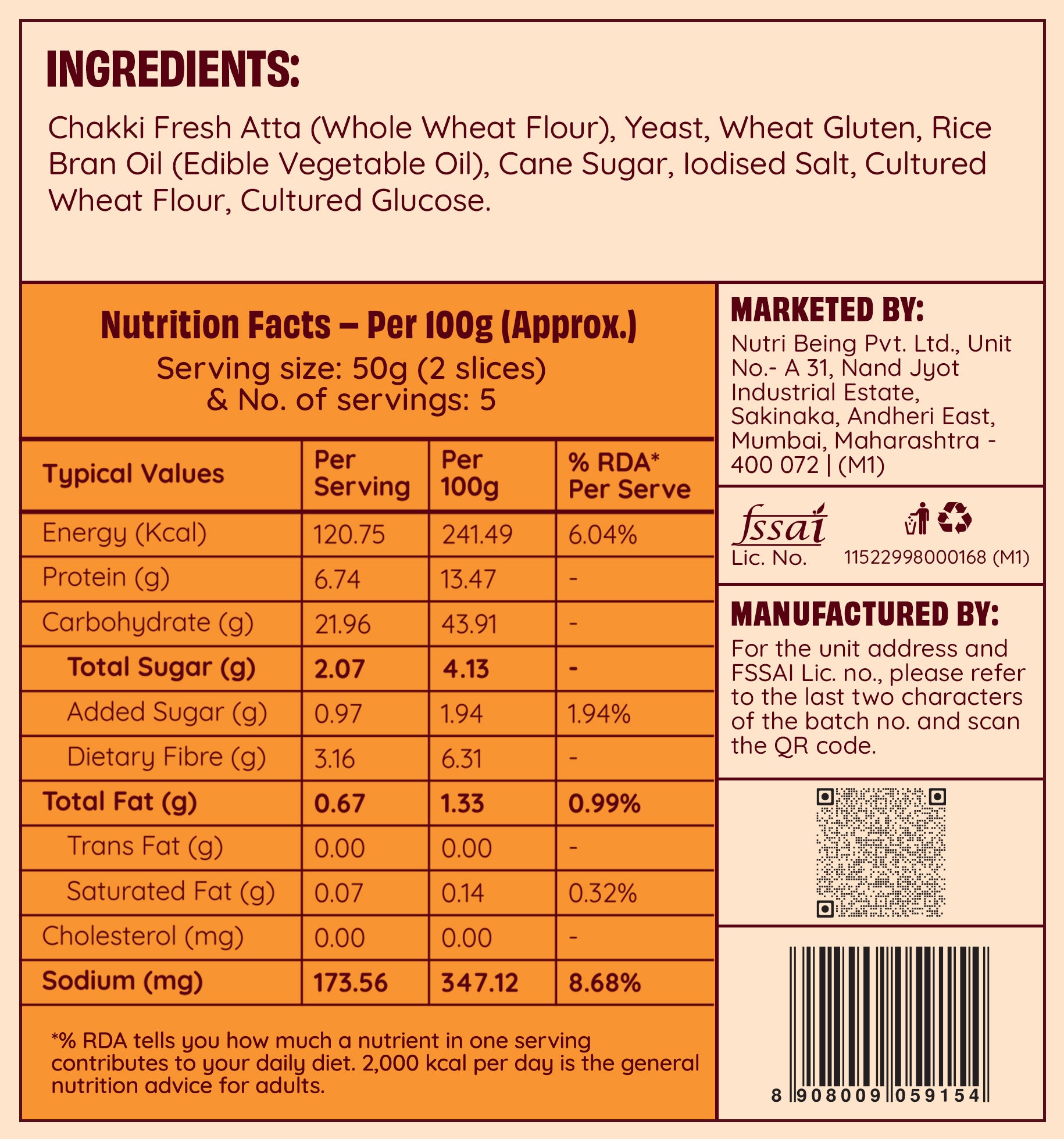 Chakki Fresh Atta (Whole Wheat Flour), Yeast, Wheat Gluten, Rice Bran Oil (Edible Vegetable Oil), Cane Sugar, Iodised Salt, Cultured Wheat Flour, Cultured Glucose.