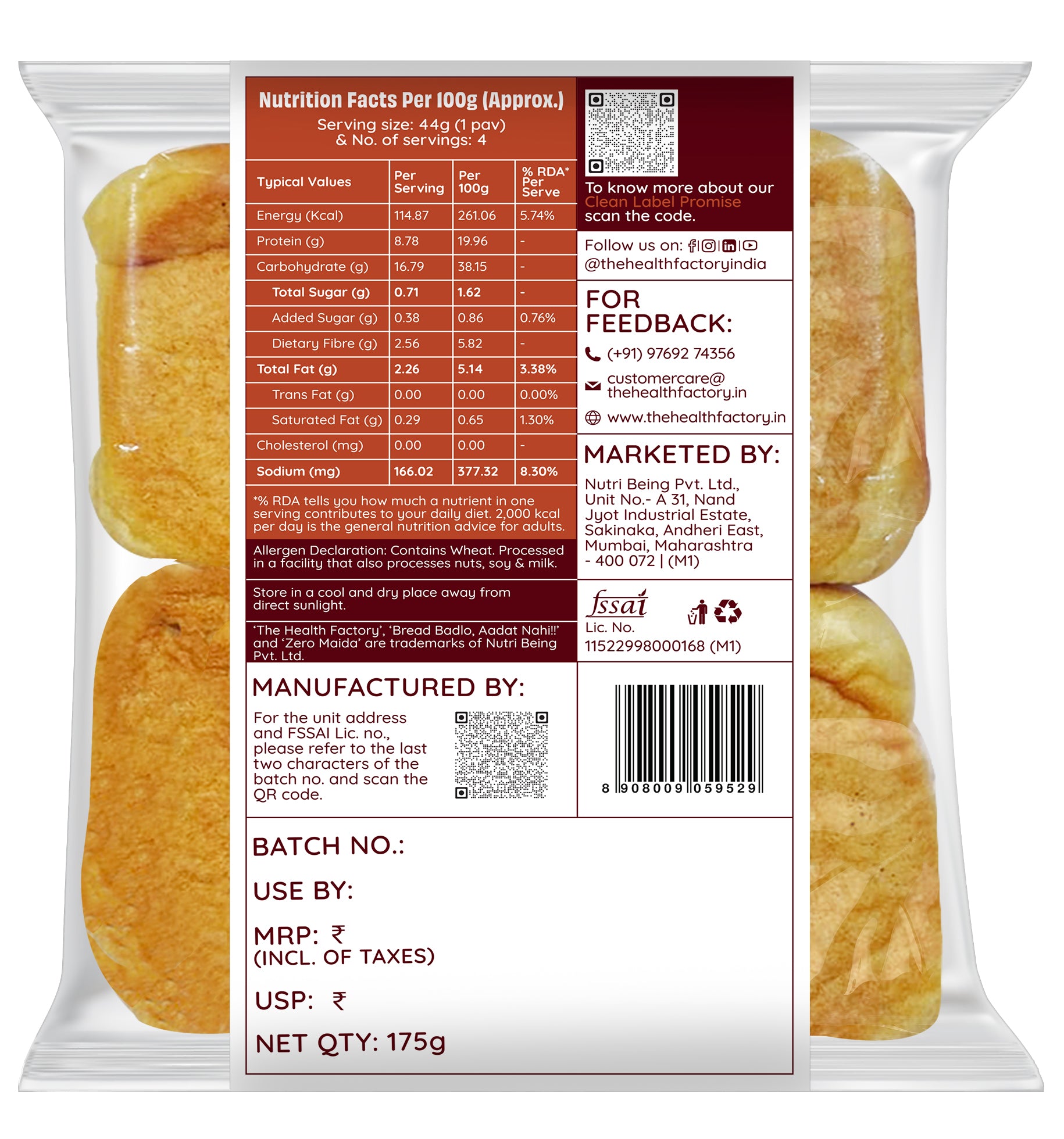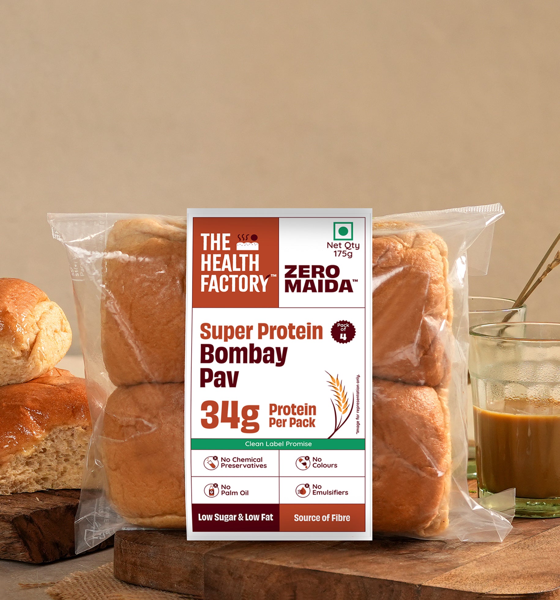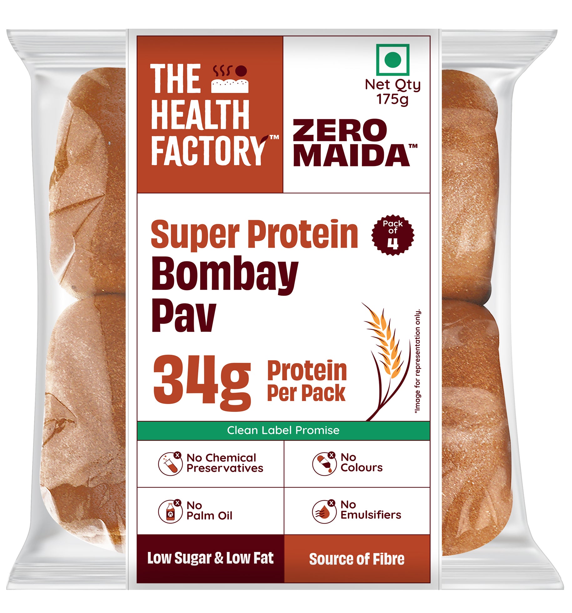 This Zero Maida Super Protein Bombay Pav is baked with whole wheat flour and a protein blend that includes whey, lentil, rice, soya, pea, and wheat protein isolates, along with peanut protein and milk solids. Additional ingredients include wheat gluten, rice bran oil, cane sugar, iodised salt, cultured wheat flour and glucose. The formulation avoids artificial colours, palm oil, and unnecessary additives.